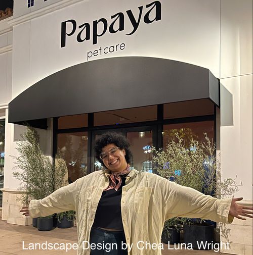 Chea standing by her design in San Diego for Ludlow Kingsley and their client Papaya, a pet care clinic.